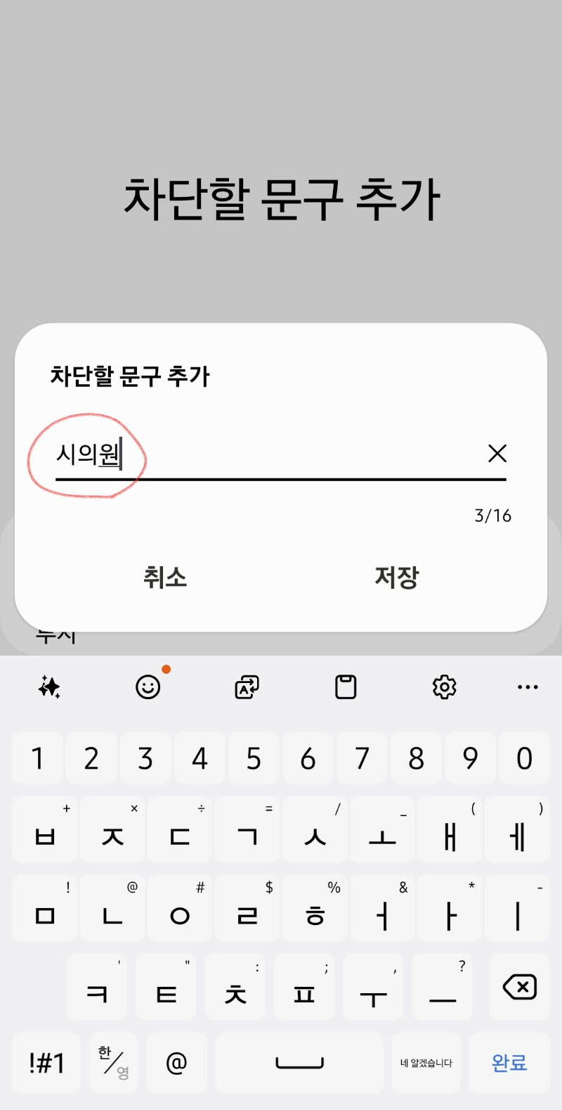 차단할 문구 추가가 뜨면 { + }를 눌러서 차단 문구 들을 입력해 줍니다. 저는 그 동안 문자들에 공통적으로 포함되어 있던 단어들을 추가 했습니다. VIP, 종목, 걱정되서, 급등, 수익, 주식 등등.