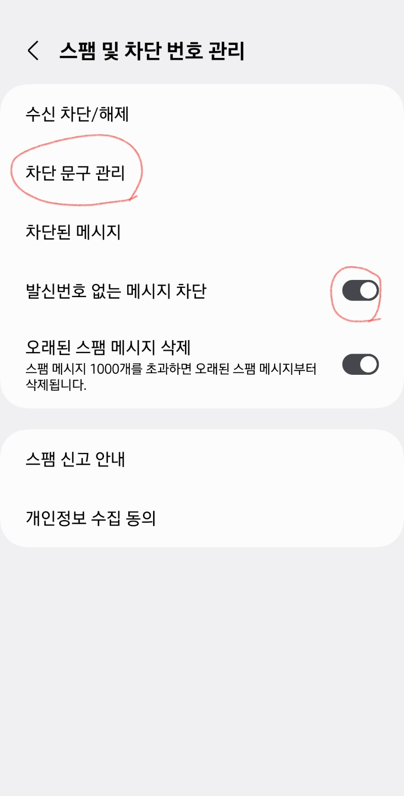 특정 문구를 추가해서 광고문자를 걸러 줄 겁니다. "차단문구관리" 눌러 줍니다.